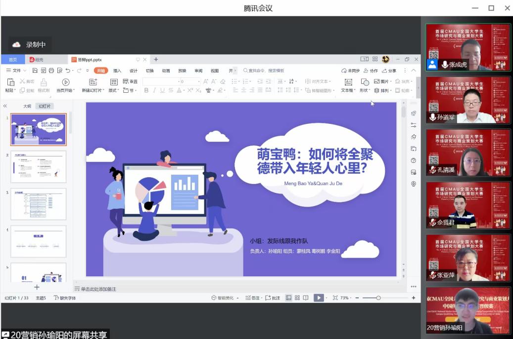 各位评委老师对各参赛队伍的综合表现给予了充分的肯定,认为参赛选手态度端正、表现优异,充分展现了各组在市场调研分析能力上的专业性以及在商业策划方面的创造性;同时,对正在经历疫情却仍出色完成调研报告答辩的同学们表示慰问。比赛最后,孙道军老师和佘贤君老师对本次比赛做了总结。