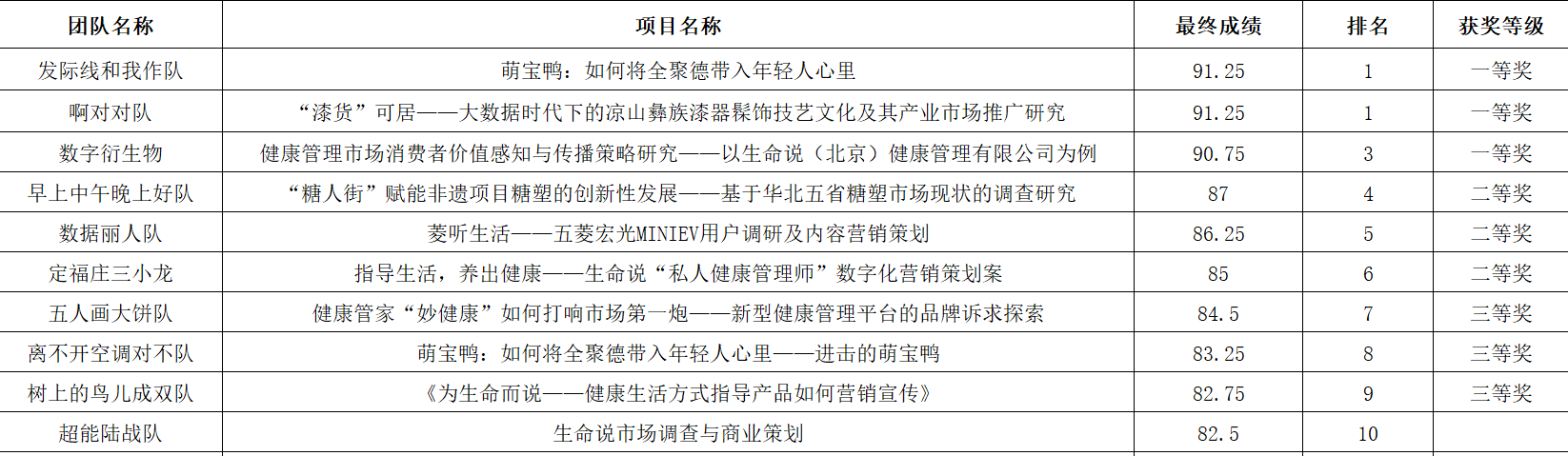 来自全校共10支队伍参加本次晋级赛的展示和答辩。经过激烈的角逐,最终有三支队伍脱颖而出,代表学校参加“北部赛区”的比赛。总评成绩排名前三的队伍分别是:选题为“萌宝鸭:如何将全聚德带入年轻人心里”的“发际线和我作队”,选题为“‘漆货’可居——大数据时代下的凉山彝族漆器髹饰技艺文化及其产业市场推广研究”的“啊对对队”和选题为“健康管理市场消费者价值感知与传播策略研究——以生命说(北京)健康管理有限公司为例”的“数字衍生物队”。