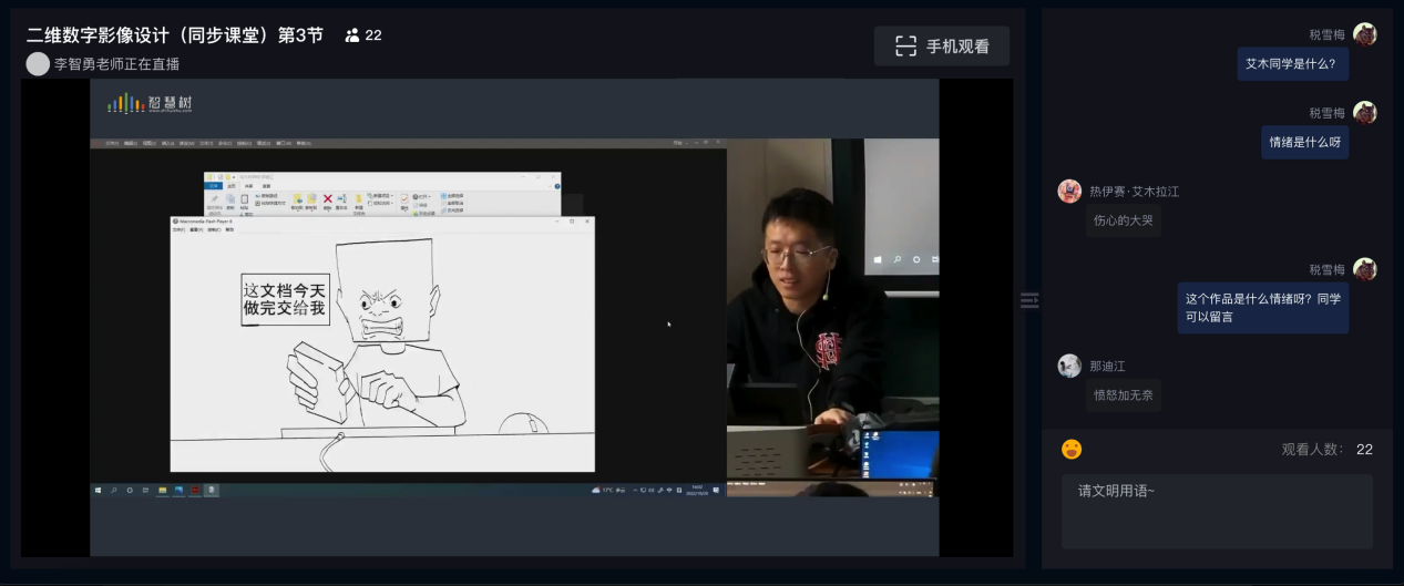 数字动画基础是中国传媒大学动画专业大一年级的必修课,也是新生入学后第一门涉及创作的动画专业课。该课程将动画艺术与技术结合讲授,基于软件展开充分的创作实践,能够引领动画新人快速入门。李智勇老师幽默风趣的讲授,为新疆艺术学院的动画学子带来了全新的体验,课程受到新疆艺术学院师生的高度好评。同学们纷纷表示,李智勇老师的课程让他们对于动画艺术充满了兴趣与求知欲。2021级动画专业学生蒲承欢在课后说:“李老师讲课幽默生动,课堂气氛很好。在认真传授知识的同时让我觉得软件并没有那么的枯燥。”新疆艺术学院传媒学院动画专业教师巴音查汗则表示:“同步课堂打破了地域限制,让我们的学生在新疆也能畅享中国传媒大学高水平的动画专业课,这对于支援提高西部地区高校的教学水平有着重要意义。” 李智勇老师表示,两地学子同上一门课,是信息化时代教学的重要创新,对于师生而言,不仅是挑战,更是机遇。