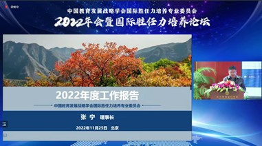 论坛上,国家留学基金委生建学秘书长、中国教育发展战略学会张双鼓常务副会长致辞,专委会张宁理事长做了2022年工作报告,联合国粮农组织原副总干事、专委会学术委员会副主任何昌垂特聘教授做了《学习二十大报告关于“全球治理与构建人类命运共同体”精神之体会》的主旨报告。清华大学、北京师范大学等高校做了有关国际组织人才培养经验及专委会科研课题的成果分享。