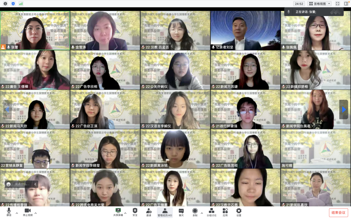 与会港澳台同学代表就中国共产党第二十次全国代表大会开幕式上习近平总书记所作的会议报告进行思想交流,畅谈学习感悟,并结合自身的生活和学习经历,表达了新一代港澳台青年的对祖国未来发展的所思所想。会议最后,张洪生书记总结发言,他指出习近平总书记所做的大会报告,鼓舞人心、催人奋进。未来五年是全面建设社会主义现代化国家开局起步的关键时期,我们要努力创新,迎难而上,顽强斗争,不断突破自我。今天很高兴能够听到同学们发自内心的感言,希望大家能够认真学习和深刻理解党的二十大精神,厚植爱国主义情怀,成为促进两岸三地文化交流合作的使者,在推进国家统一、民族复兴的伟大征程中奉献青春力量。