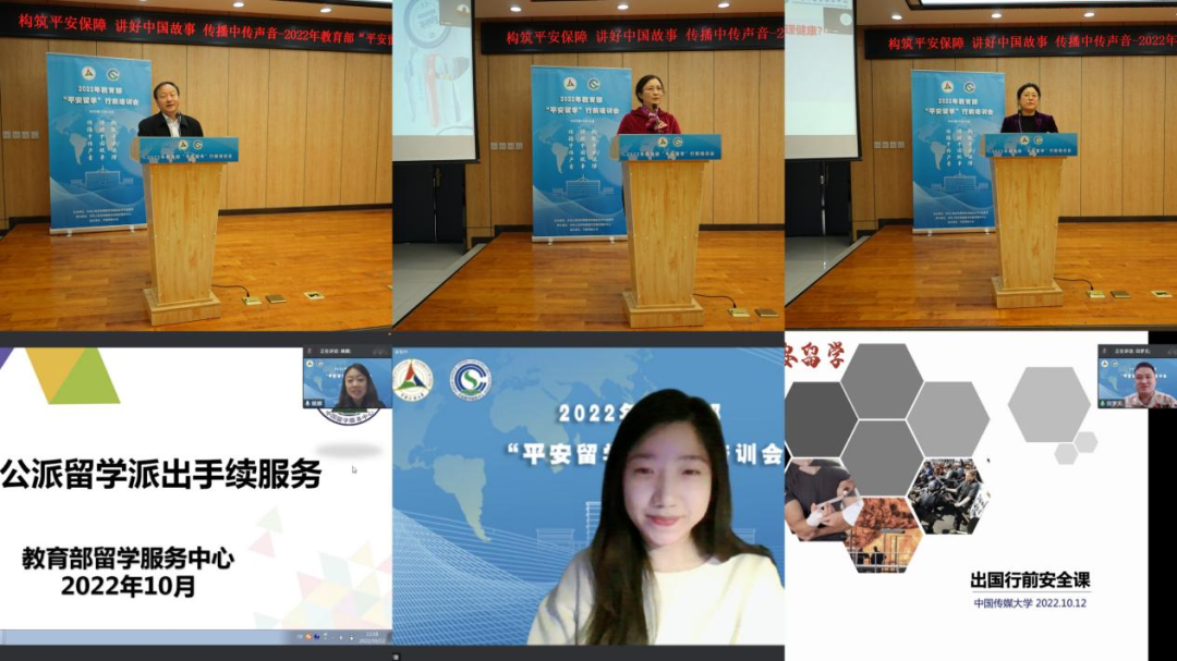我校自成为教育部“平安留学”行前培训协办单位以来,围绕“立德树人”根本任务,从完善“平安留学”校内工作机制,强化留学人员思想政治引领,提高留学人员安全风险防范意识,创新宣传形式、提升普及质效,开展专项课题调研等层面入手,通过召开“构筑平安保障 讲好中国故事 传播中传声音”——2022年教育部“平安留学”行前培训会等,为准备出国留学的师生,提供外交领事保护、公派留学手续、安保实操培训、心理健康、国外适应等方面的专业知识,弘扬爱国传统,筑牢安全屏障。