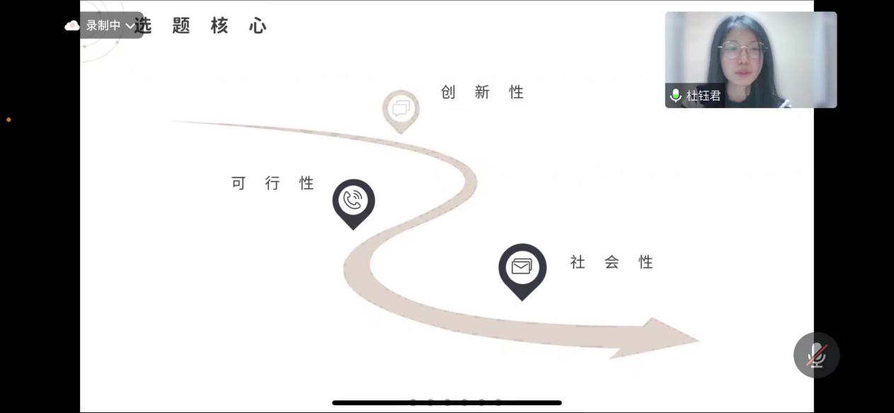 杜钰君同学向大家明确了赛事的时间节点,围绕选题核心这一主题,提出了三组关键词:创新性、可行性、社会性。创新性项目需要新的亮点,可行性项目要突出团队的核心竞争力,社会性项目具有社会价值。她谈到,组队要发挥出不同专业的队员的长处,细化提问,多沟通交流,善于借力和包装,懂的运用身边的资源为项目增添光彩。