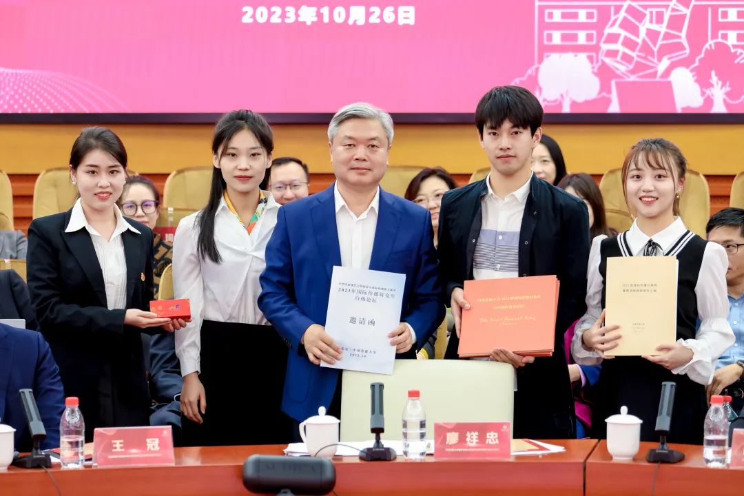 2022级白杨班硕士生俞璐铭、付瀚爽、董静格和博士生王方辰作为首届白杨班学生代表,向班主任廖祥忠提交了一年多来的培养成果,包括《小白杨的成长记录》和《暑期调研影像》两个平面视觉作品、暑期调研报告汇编册、学生融媒体作品集锦等。