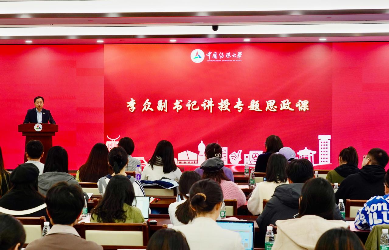 李众为同学们讲授“习近平新时代中国特色社会主义思想概论”专题思政课。李众表示,学习习近平新时代中国特色社会主义思想,要做到“真学、真懂、真信、真用”。李众向同学们阐释了中国特色社会主义事业经济建设、政治建设、文化建设、社会建设、生态文明建设“五位一体”总体布局与“十个明确”“十四个坚持”“十三个方面成就”的基本结构和丰富内涵,介绍了学校在教育实践中的重要举措。他鼓励同学们要系统学习党的创新理论和精髓要义,从认认真真读原著、学原文、悟原理入手,逐字逐句学、逐篇逐段悟,提升学习穿透力,保持学习常态化,以“真学”筑牢信仰之基。
