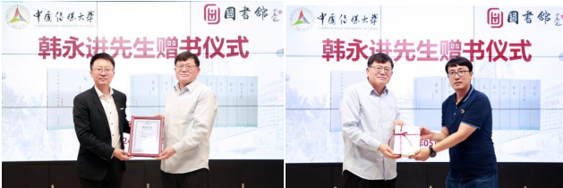 韩永进以个人名义向我校图书馆捐赠一套《中华传统文化百部经典》,鼓励师生多读经典,图书馆副馆长侯新宇代表图书馆接受赠书,杨懿代表学校向韩永进颁发捐赠证书。