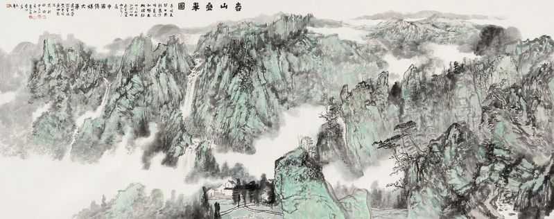 《春山叠翠图》以大写意的手法勾勒出山峦层叠、苍翠欲滴的自然壮景,象征着学校的发展如春山般生机勃勃,未来如绿水般清澈悠远。