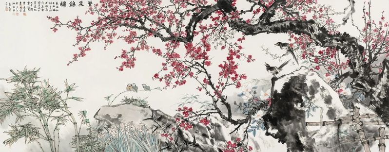 《繁花锦绣》展现出一幅生机勃勃、春意盎然的景象,代表中华文化清雅之风的梅、竹、兰,是对学校师生在学术研究道路上不懈追求的赞美。每一笔、每一墨都是对学校的深情厚谊,寄托着中国画博士班师生对学校未来辉煌成就的坚定信心与美好祝福。