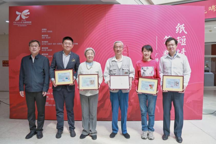 在藏品捐助仪式环节,中国传媒大学党委副书记、纪委书记蔺海波代表学校向为此次展览捐赠展品的广播先辈亲属代表——温飈、齐虹、胡晓林、崔红、李奥利、李理颁发了捐赠证书。