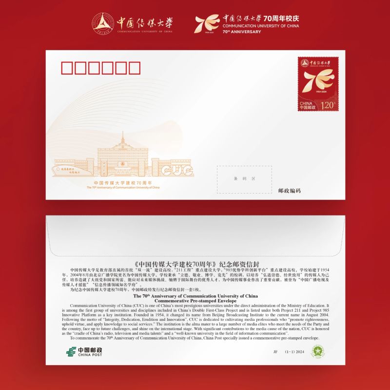 配有《中国传媒大学70周年校庆》纪念封
