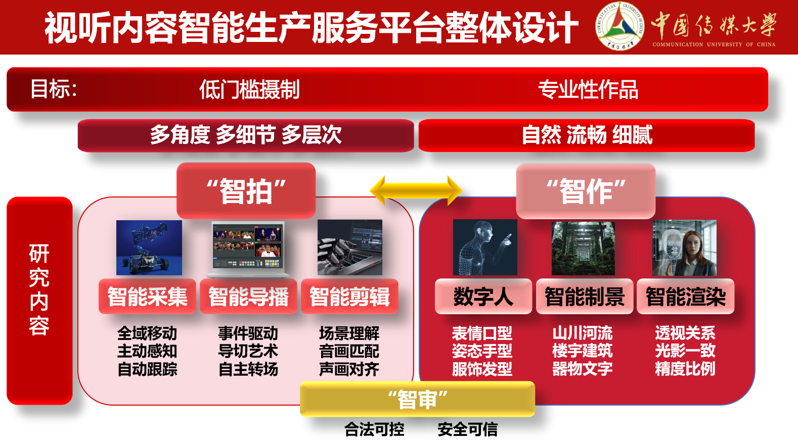 柴剑平在大会期间接受河北电视台专访并表示,学校高度重视产学研转化,出台了一系列措施,鼓励各学院推进科技成果转化应用。着力构建教育、科技、人才“三位一体”融合发展格局,在AI赋能视听内容生产领域取得了关键突破。《视听内容智能生产服务平台》首创"智拍-智作-智审"全链条技术体系,从智能拍摄,智能导播,智能剪辑,智能制作,智能审核等部分展开,利用AI技术赋能视听内容生产,同时兼顾低门槛和专业性,推动视听生产从人工密集型向AI自主化转型。平台将在演艺场景的智能导播,面向直播场景的图文新闻生成和短视频的智能剪辑等应用场景落地。