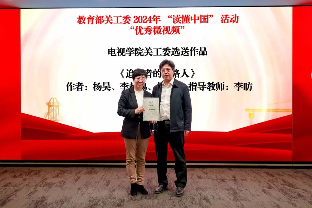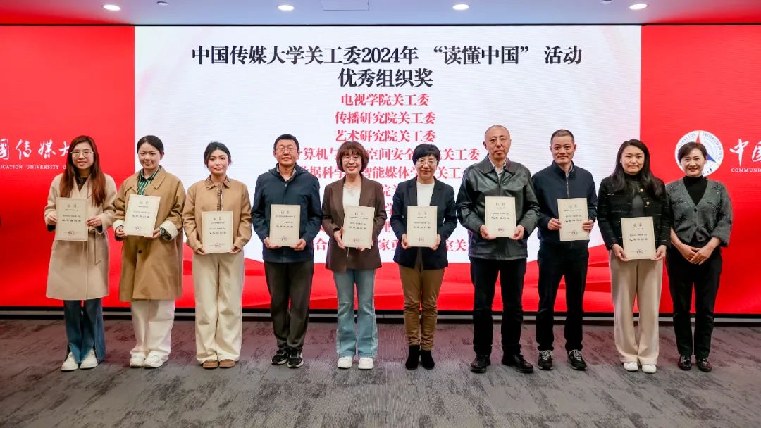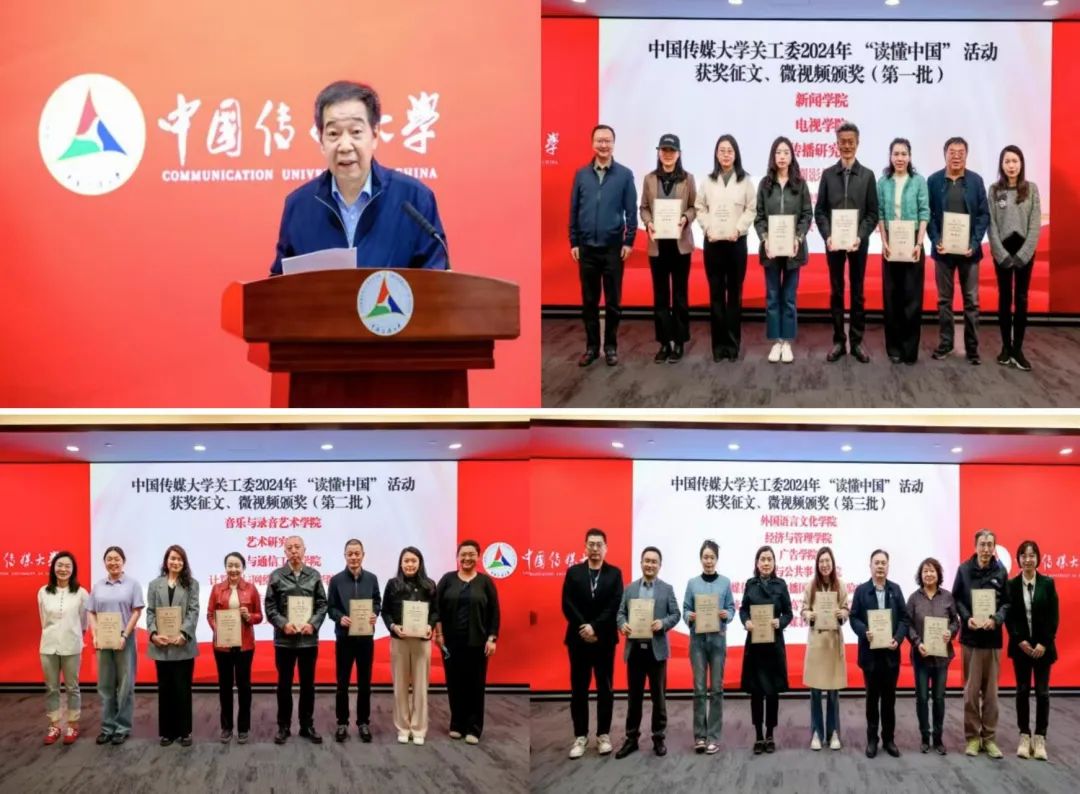 寇宏亮宣读《关于中国传媒大学关工委2024 年“读懂中国”活动获奖名单的通报》。学校关工委副主任单位负责人朱传欣、储钰琦、郭婧娜、刘幼春、袁冶、张琳为学校关工委2024年“读懂中国”活动34个“优秀征文”和17个“优秀微视频”的获奖代表颁发证书。