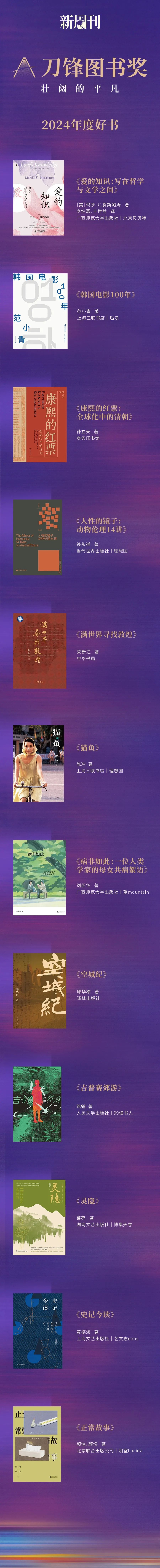 2024年刀锋图书奖以“壮阔的平凡”为主题,由湖北省作协主席、作家李修文担任推委会主席,与陈鲁豫、许纪霖、周濂等14位推委会成员评选出2024年的年度榜单,强调通过文字记录生活的质地、捕捉日常中的哲思。