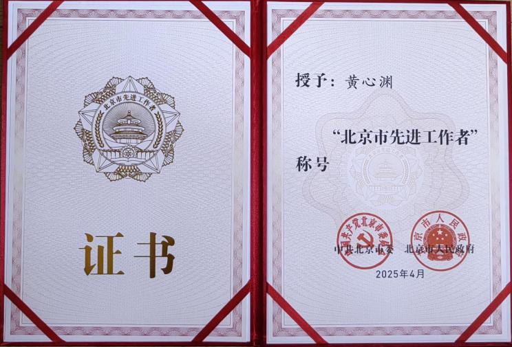 (黄心渊荣获“北京市先进工作者”证书和奖章)