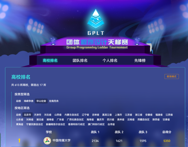 “中国高校计算机大赛——团体程序设计天梯赛”是国内计算机领域的权威赛事,自2019年起连续入围中国高等教育学会“全国普通高校大学生竞赛排行榜”竞赛项目榜单。大赛以培养高校学生的计算思维、程序设计能力与团队协作精神为宗旨,致力于全面提升我国高校计算机人才培养水平。经过多年发展,该赛事影响力持续扩大,已成为全国高校计算机专业师生高度关注的品牌赛事。2025年大赛延续“个人独立竞技、团体计分”的赛制,吸引了来自全国613所高校的1972支队伍参赛。