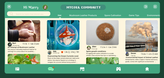 视觉风格上,创作团队选择了充满活力的翠绿色调和生机勃勃的森林元素,创造出一个既科学又充满童话感的世界。红白相间的蘑菇角色形象既符合公众对蘑菇的认知,又增添了游戏的趣味性和辨识度。整体界面采用了圆润有机的设计语言,呼应自然生长的主题。