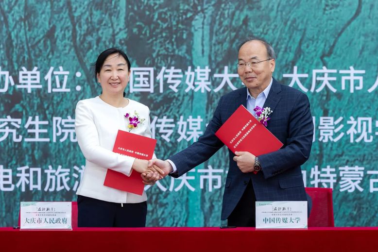 中国传媒大学党委常委、副校长刘守训与大庆市副市长朱清霞代表双方签订红色研学实习实践基地合作协议。