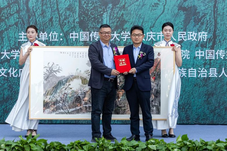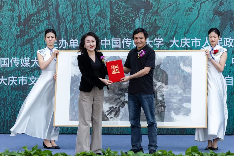 中国传媒大学研究生院院长任孟山代表学校向大庆市人民政府赠送中国画博士生导师、研究员集体创作的作品《春和景明图》。