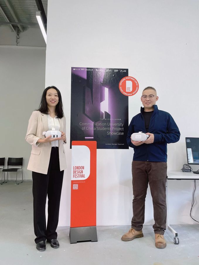 伦敦设计周的“Tender Interbeing”主题沉浸展由英国南安普顿大学与中国传媒大学联合主办,呈现了十余部Design for Future的VR沉浸类作品,其中包括两校联合沉浸工作坊孵化项目成果6部,包括:2021级影视摄影与制作专业虚拟影像制作方向吴成奥团队的VR作品《视差之间》、2024级艺术学硕士张子颖团队的VR戏剧作品《西西弗斯之前》、2020级摄影系刘晗团队的VR音乐作品《Particle微粒》;展映了戏剧影视学院优秀毕业设计4部:2021级影视摄影与制作专业虚拟影像制作方向唐艺菲短片《暮歌》,赵月晗VR交互作品《比萨手札》,2020级影视摄影与制作专业虚拟影像制作方向耿子妍AI+VR作品《水消失在水中》、吕欣阳AI+VR作品《备注》;中传戴尔联合创新实验室AIGC获奖作品。