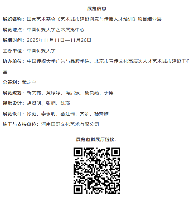 11月11日,国家艺术基金2025年度资助项目《艺术城市建设创意与传播人才培训》结业展开幕式在中传学术中心举行。展览由中国传媒大学主办,中国传媒大学广告与品牌学院、北京市宣传文化高层次人才艺术城市建设工作室协办,以“走向艺术城市”为主题,集中呈现项目成果与学员创作实践。
