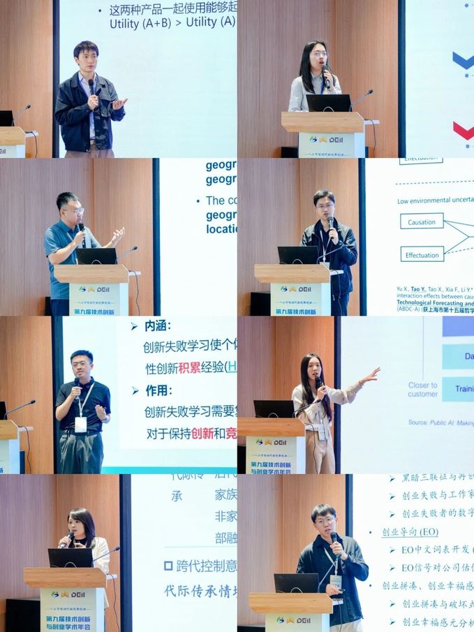 在青年学者论坛,石先蔚、黄佩媛、马鹏程、陶奕达、王红锌、杨季枫、曾颖娴、曹港,8位青年学者围绕创业生态、风险投资、技术治理、AI研究方法等作主题演讲,与会专家进行了现场点评。