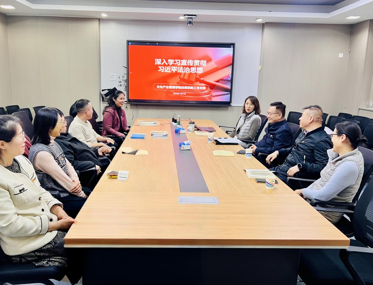 (通讯员 程科 摄影 叶怀阳 胥迪)12月10日下午,中国传媒大学文化产业管理学院法律系教工党支部举行集体学习会,围绕“深入学习宣传贯彻习近平法治思想”主题,结合中央全面依法治国工作会议精神与新近出版的《习近平法治思想学习纲要(2025版)》展开深入研讨。党委常委、副校长李新军出席会议并参与交流。文化产业管理学院院长张洪生列席会议,法律系主任郑宁教授主持会议。
