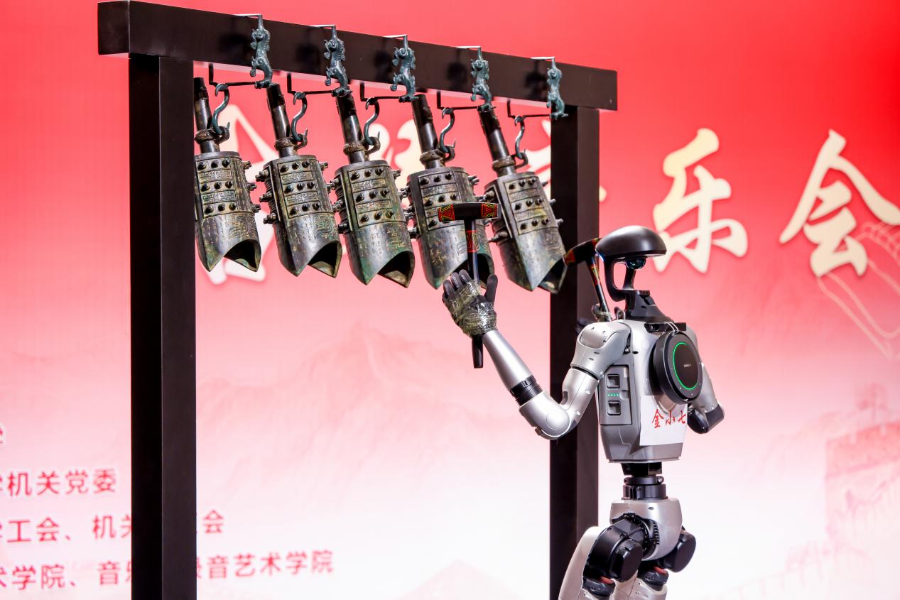 演出开始,打击乐演员机器人“金福星”、舞蹈演员机器狗“金多多”率先登场,精准的编钟演奏,灵活的翻腾跳跃, 耳目一新的AI乐舞表演给观众带来了科技与艺术融合的全新感受。