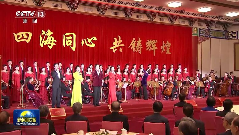 文艺工作者现场表演了精彩的节目。最后,全场起立高唱《团结就是力量》。会场内洋溢着喜庆祥和的节日气氛。