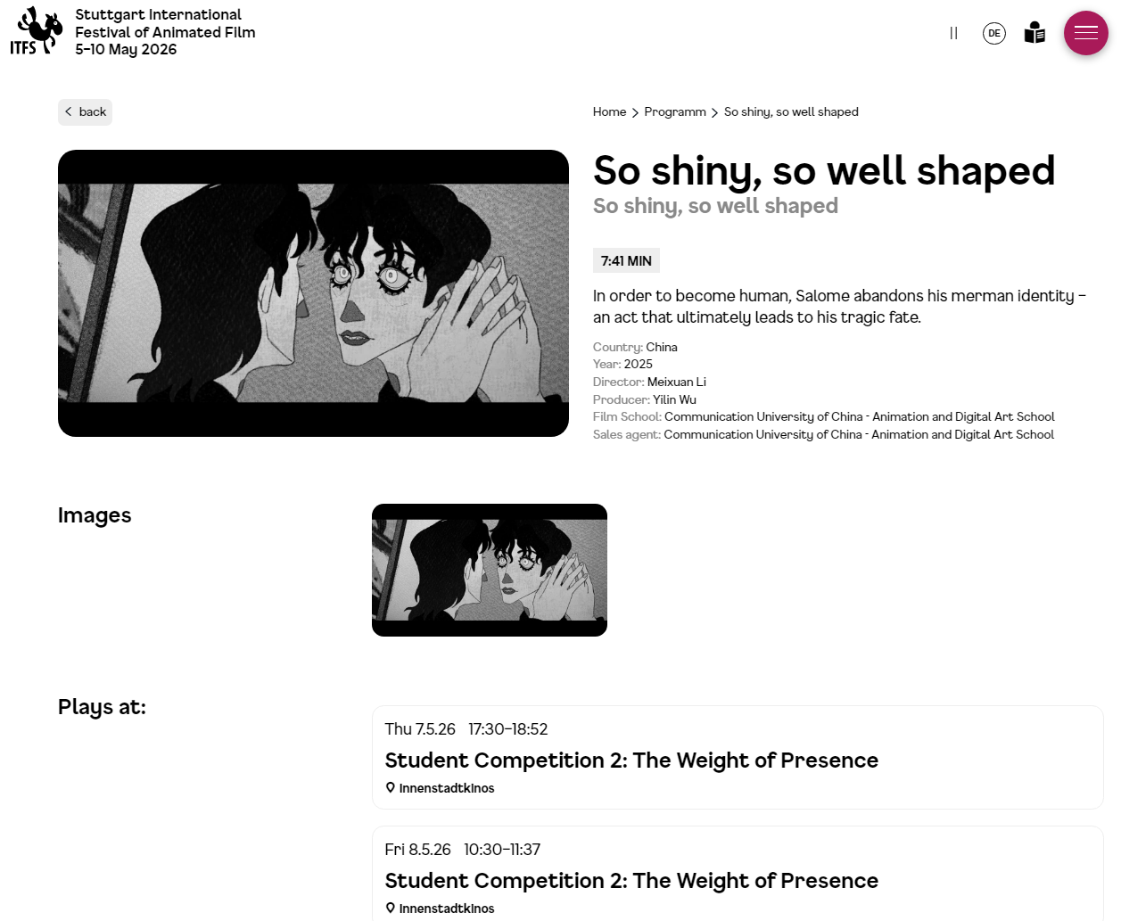 斯图加特国际动画节创办于1982年,是当今国际上最负盛名的动画节之一,也是同时具有奥斯卡奖与欧洲动画埃米尔奖资格认证的权威节展。2026年,动画节将于5月5日至10日在德国西南部城市斯图加特举办,届时《如此光鲜亮丽,如此形状姣好》将在活动现场进行展映。