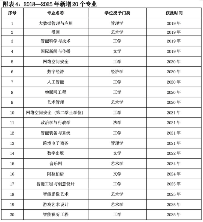 据介绍,中国传媒大学自2018年到2025年期间,新增了20个专业,其中包括早在2019年设置的智能科学与技术、国际新闻传播等以及2025年新增的智能影像技术、游戏艺术设计以及智能视听工程等。