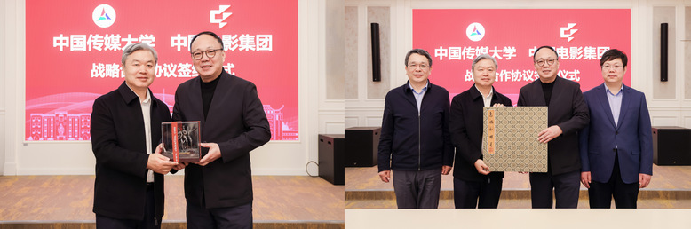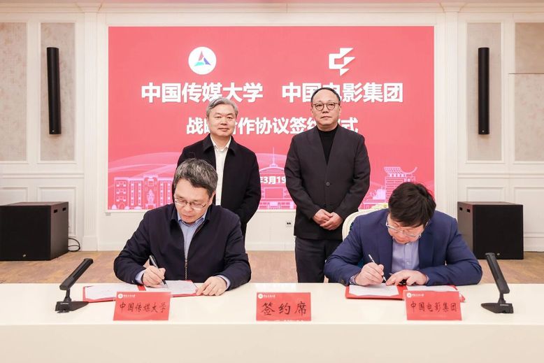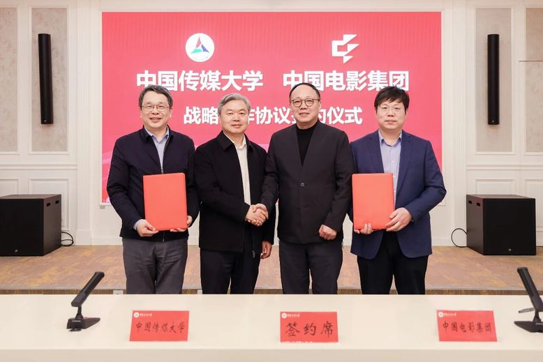 中影集团人才发展中心、董事会办公室、中影制片厂、中影进口发行公司、中影科技公司、中影AI研究院等相关负责人,中国传媒大学党政办公室、学生工作部(处)、科学研究处、本科生院、戏剧影视学院、动画与数字艺术学院、计算机与网络空间安全学院、数据科学与智能媒体学院、国内交流与合作处等相关负责人共同参加此次签约仪式。