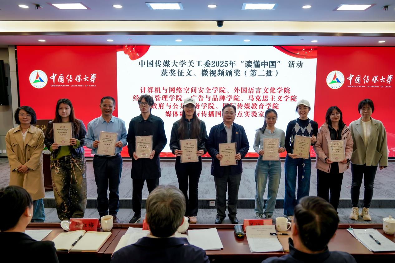 学校关工委副主任单位负责人代表朱传欣、张琳、王芯蕊、刘幼春为学校关工委2025年“读懂中国”活动27个“优秀征文”和15个“优秀微视频”的获奖代表颁发证书。