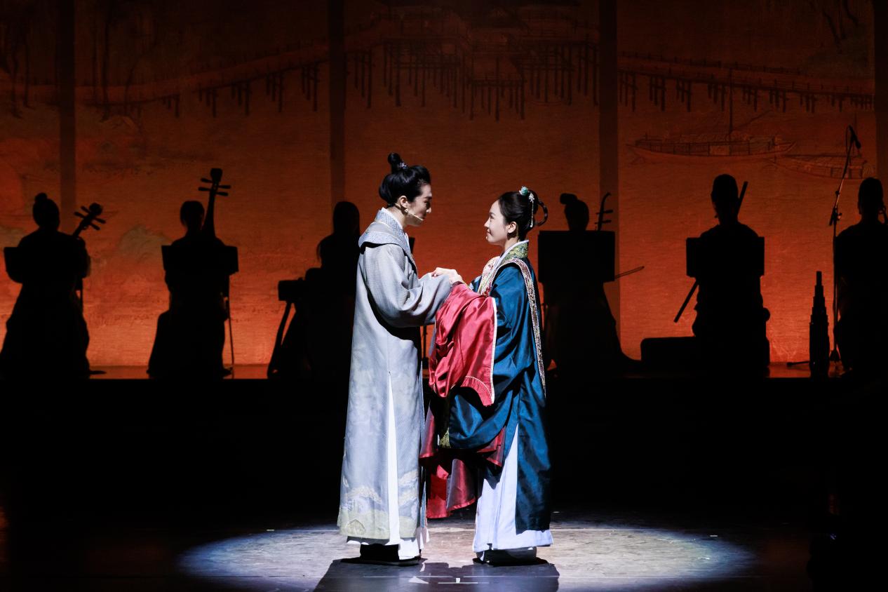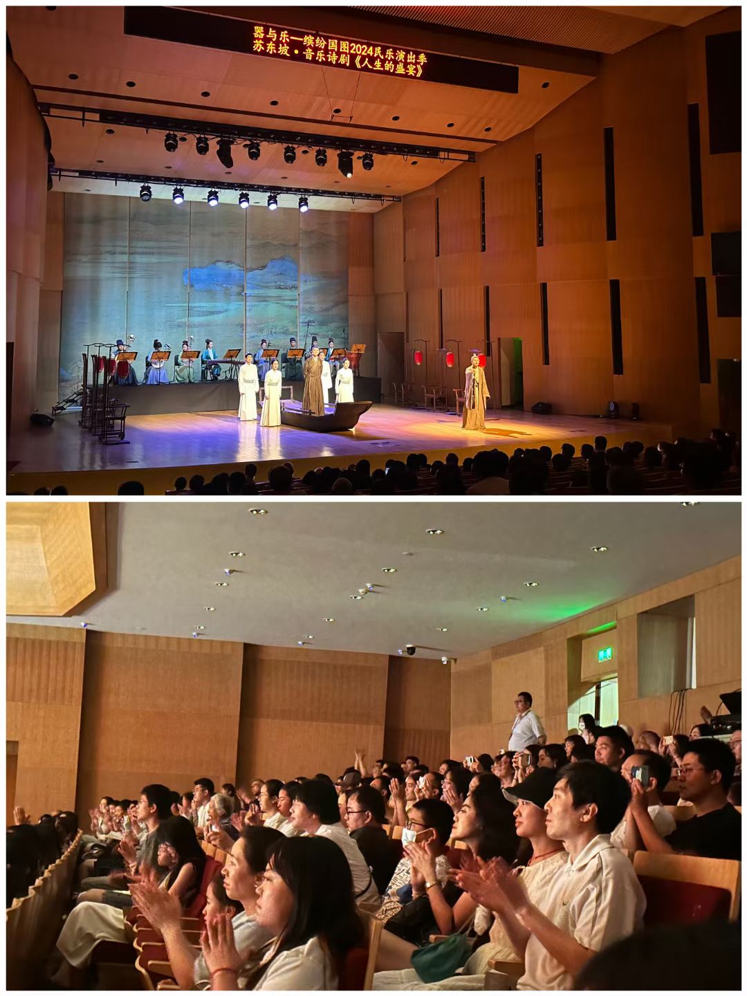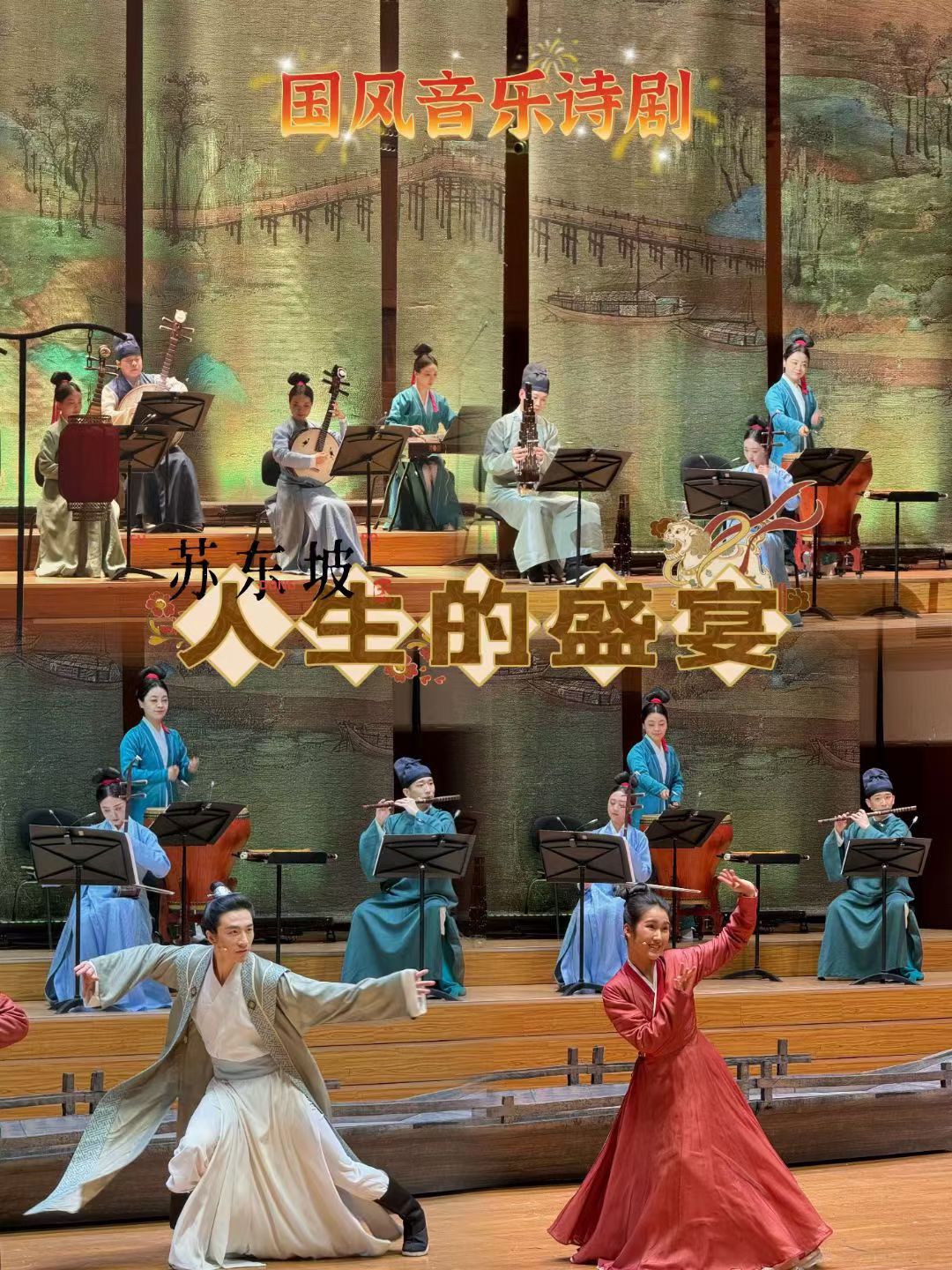 该剧打造了“诗词+音乐+朗诵+戏剧”的多元融合形式,串联《水调歌头·明月几时有》《定风波·莫听穿林打叶声》等22首经典诗词,塑造出有血有肉、兼具才情与烟火气的苏轼形象,传递其“一蓑烟雨任平生”的旷达与“此心安处是吾乡”的人生智慧。剧中搭配24支原创乐曲与经典古曲,由北京民族乐团玖乐室内乐组合现场演奏,音乐节奏与诗词意境、人物情绪高度契合,民乐演奏与表演无缝衔接,实现听觉与视觉双重联动。