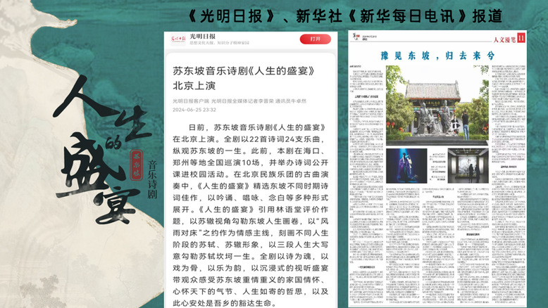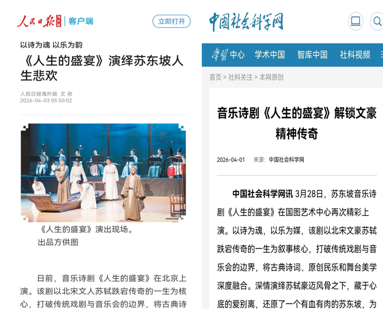 3月31日,人民日报客户端、《人民日报(海外版)》以《以诗为魂,以乐为媒:<人生的盛宴>演绎苏东坡人生悲欢》为题报道此剧,中国社科网、中国网、顶端新闻等多家媒体报道。该剧自2023年12月在北京音乐厅首演,已在北京、郑州、海口等地巡演十多场,获得新华社、《光明日报》等多家媒体报道。