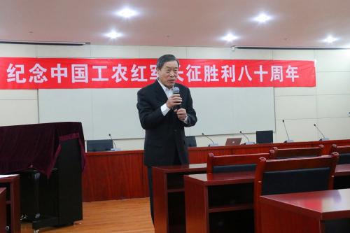 首先,关工委委员、老教授协会副会长冯宋彻教授讲述了红军长征的概况以及长征的伟大历史意义。从1934年10月至1936年10月,红军第一、第二、第四方面军和第二十五军进行了伟大的长征,红军以非凡的智慧和大无畏的英雄气概,战胜千难万险,付出巨大牺牲,胜利完成震撼世界、彪炳史册的长征。在长征途中,英雄的红军血战湘江,四渡赤水,巧渡金沙江,强渡大渡河,飞夺泸定桥,爬雪山、过草地。在征途中,红军将士同敌人进行了600余次战役战斗,跨越近百条江河,攀越40余座高山险峰,纵横十余省,长驱二万五千里。长征的胜利,是中国共产党人理想的胜利,是中国共产党人信念的胜利,没有任何力量能够动摇中国共产党人的理想信念。今天,我们更要弘扬长征精神,不忘初心,继续前进,理想信念在心中,长征永远在路上。我们这一代人的长征,就是要实现“两个一百年”奋斗目标、实现中华民族伟大复兴的中国梦。