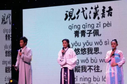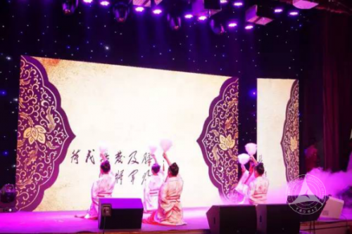 晚会以“弘扬传统文化”为主旨,分为“初筵”“笙鼓”“夜饮”三个板块,多方位为观众展现了中华传统文化的魅力。开场由一曲《无归》引入,悠扬动听的乐曲伴着舞者曼妙的舞姿,将观众拉近古典文化营造的艺术氛围中。朱许望同学带来歌曲《清平调》,圆润的嗓音与优美的音乐让人沉醉。郝思雨等同学带来的古风诗朗诵《逆流而上》,巴邓顿珠与王博然两位同学联手带来的《兰亭集序》为观众们展现出了中华文字的优美意境,让观众们感受到中国书法艺术的博大精深。