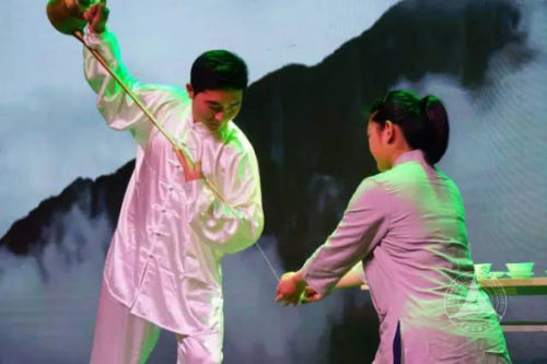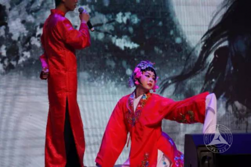 第二单元“笙鼓”在贾斐然等同学带来的歌舞《典狱司》中拉开序幕。王天翔同学和程柄舜同学的一曲《青花瓷》将观众带进烟雨江南的意境中。黄峥妍同学表演了太极拳、刘馨瞳等同学带来了传统乐器串烧。刘冰先生与他的徒弟刘灵恩表演的豫剧《穆桂英挂帅》将传统戏曲演绎得淋漓尽致,赢得现场阵阵掌声。