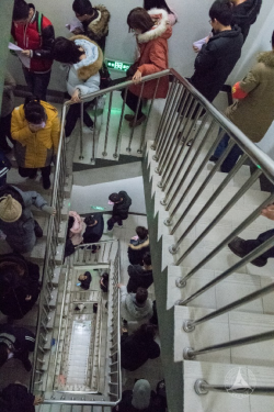 消防疏散演练部分,在现场总指挥科技处处长王永滨老师下达开始演练指令后,负责点火的人员在楼内6层某实验室外制造模拟火源(燃放烟片),负责报火警的实验室安全员随即按下楼道内的手动报警器按钮,消防控制室接报火警后立即向指挥部报告火情,指挥部迅速发布命令启动疏散、搜救、灭火预案,在现场消防教官的指导下,组织引导集中位于6层和8层的实验室师生共计约250人分别从南、北两个楼梯安全通道向楼下撤离,出楼后在楼门口外集合,并清点、报告人数。同时,负责灭火的实验室安全员、保安消防员分别持灭火器、接水龙带模拟灭火,负责搜救任务的保安消防员将现场一名模拟受伤被困人员抬出楼外医疗站救治。