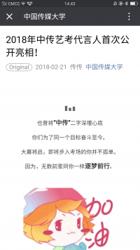 2018艺考前夕,一条“2018中传艺考代言人首次公开亮相”的推送刷爆了中传人和艺考生的朋友圈,康辉、马思纯等通过艺考进入中传的知名校友在视频中为各位考生加油打气,预祝大家艺考顺利。同时刷屏的还有一个互动性强的H5,以“中国传媒大学给你发来一条消息”为题,将艺考的注意事项、考场规则等在互动对话中全部提示给考生,在为考生加油打气的同时再度强调了考场纪律和注意事项。据了解,今年艺考前后,中国传媒大学会继续发挥媒体专业特色和新媒体技术特长,推送VR考场先知道、艺考代言人加油打气等服务信息,并在艺考首日开通官方直播频道,各个艺考相关专业和学院也将充分利用学院官方微信即时推送艺考动态和考试信息,方便广大考生及家长第一时间了解艺考资讯。