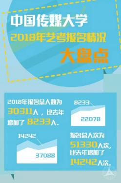 根据中国传媒大学本科招生办公众号发布的数据显示,2018年,中国传媒大学19个艺术类本科专业计划招生703人。从报名数据上看,2018年中国传媒大学艺术类本科专业报名总人数为30311人,共51330人次,同比去年增加了8233人和14242人次。其中,播音与主持艺术、表演、广播电视编导(电视编辑方向)三个专业报名人数最多。表演、广播电视编导(电视编辑方向)、戏剧影视导演三个专业竞争最激烈,报录比分别是327:1、144:1、134:1。
