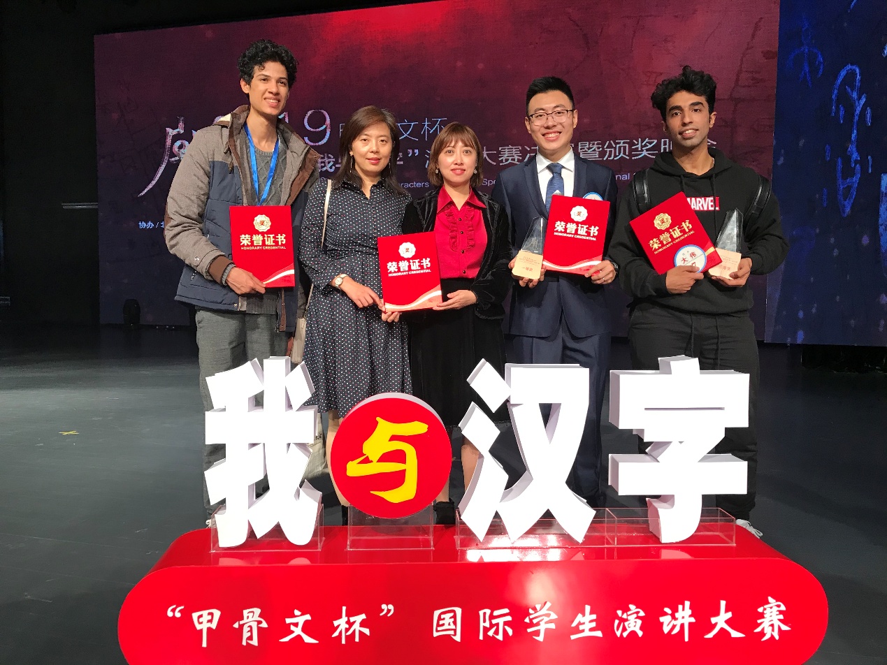 22日晚,“2019‘甲骨文杯’国际学生‘我与汉字’演讲大赛”决赛暨颁奖晚会在安阳市职工文化体育中心隆重举行,15个国家的24名留学生选手参加了比赛。我校三名参赛选手一一登台,讲述自己和汉字的故事。京盛以《京盛与“京”》为题,讲述了自己与“京”字的故事,大伟用一口地道的河南方言开场,介绍了自己心中“最浪漫的汉字“她””的魅力,为题的演讲;刘正曦则以《我与汉字的邂逅》为主题,介绍了他学习汉语的心路历程。