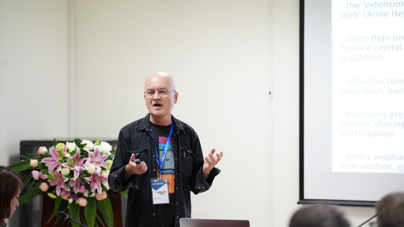 随后的圆桌主旨演讲由中国传媒大学顾洁教授主持。Global Media and China期刊总主编、香港中文大学Anthony Fung教授率先进行《关于数字劳工的幸福与满足:中国抖音玩家的个案研究》的分享。该研究基于对抖音上的十个职业制作群的深入采访,旨在探索数字视频平台如何从根本上改变传统职业中的“生产程序”。研究发现数字劳动者并非依赖于以生产为生的物质主义报酬,工作者们可以重新发掘自己在工作中的满足感、信心和自主权,最终升华为与大多数劳动力的固有身份不同的创造者。