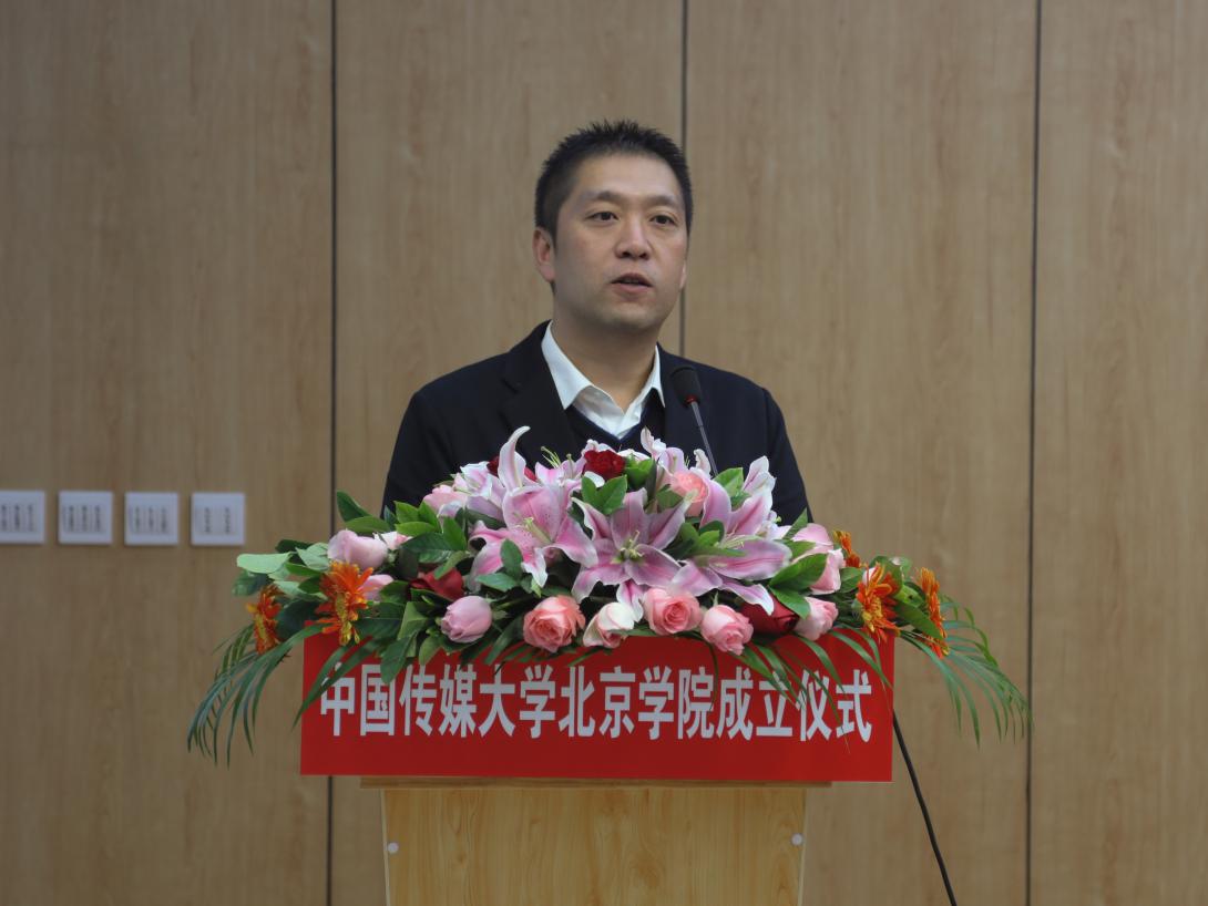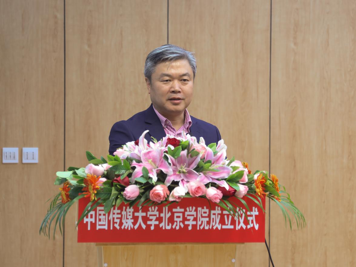 北京市教委高教处处长刘霄在讲话中对我校北京学院的成立表示祝贺。他高度肯定了我校的特色育人理念及改革举措,对我校为北京高等教育发展做出的贡献表示感谢。他指出,自2015年以来,中国传媒大学通过参与北京市“双培计划”为打通地区优质教育资源、促进北京基础教育和高中教育均衡发展提供了强大助力,并对未来通过北京学院这一纽带,加强中国传媒大学与北京市在人才培养、科研创新、社会服务、文化传承发展、国际交流合作等方面的深入合作表示期待。