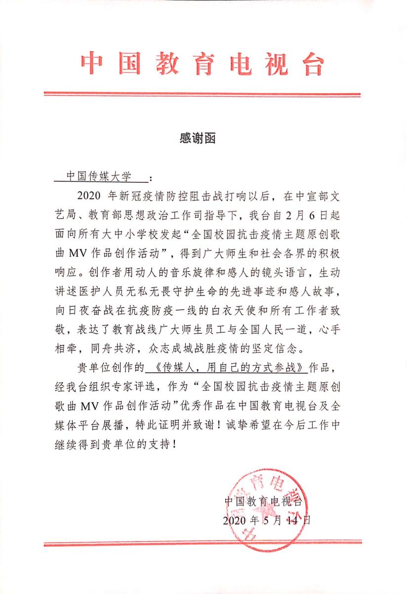 (通讯员 吉也)由中国传媒大学出品,音乐与录音艺术学院博士生、本科生以及毕业生共同创作的原创歌曲《传媒人,用自己的方式参战》,在疫情期间推出后广受社会各界好评。日前,中国教育电视台特此向学校发来感谢函,向传媒学子在疫情期间所做出的工作表达了肯定与感谢,并希望今后继续得到中国传媒大学的支持。