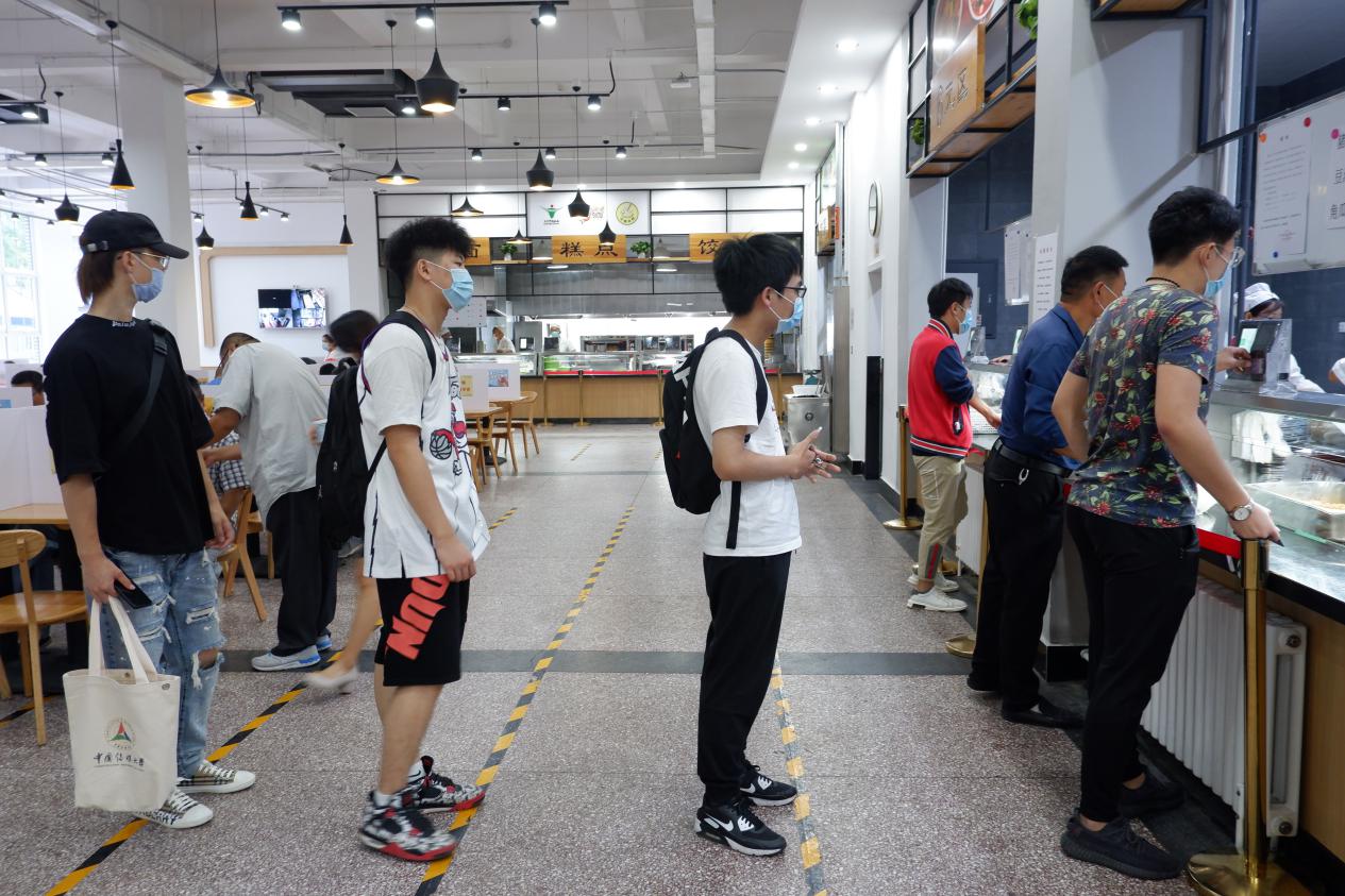 “跨越山川湖海,中传迎你到来”“亲爱的小白杨,欢迎回家”……在返校报到现场、主要道路、宿舍楼、餐厅等地摆放或悬挂着欢迎标语、条幅,气氛温馨。在窗明几净、焕然一新的餐厅,工作人员耐心地引导大家扫码登记,单向进出,使用流动水或免洗洗手液洗手、消毒,有序安心就餐。