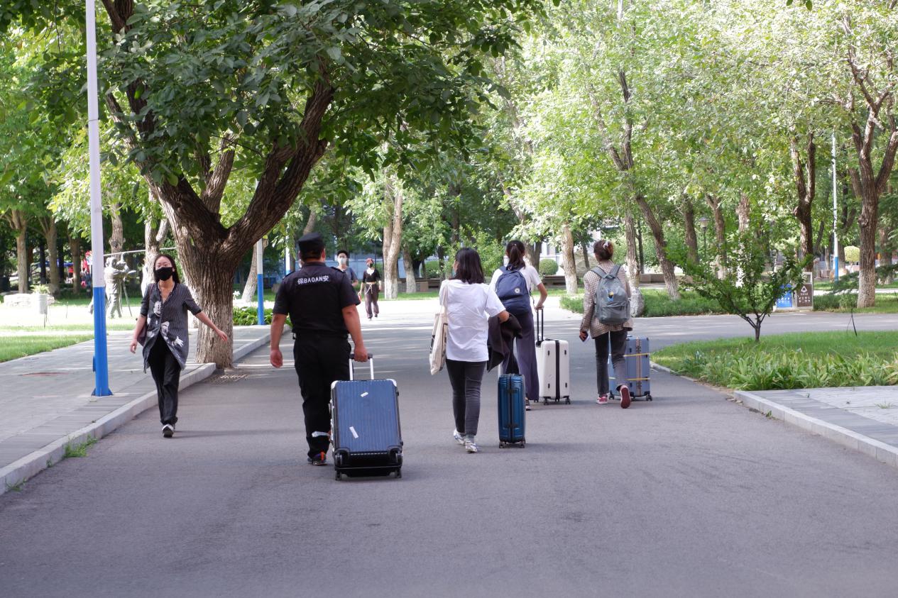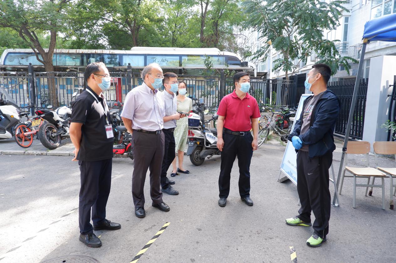 校党委副书记姜绪范、副校长刘守训、北京市委教育工委驻校联络员闫彦斌等先后来到学校大门、梆子井学生公寓、北苑餐厅、校医院等地,看望工作人员,查看学生返校组织情况,并和学生亲切交流。