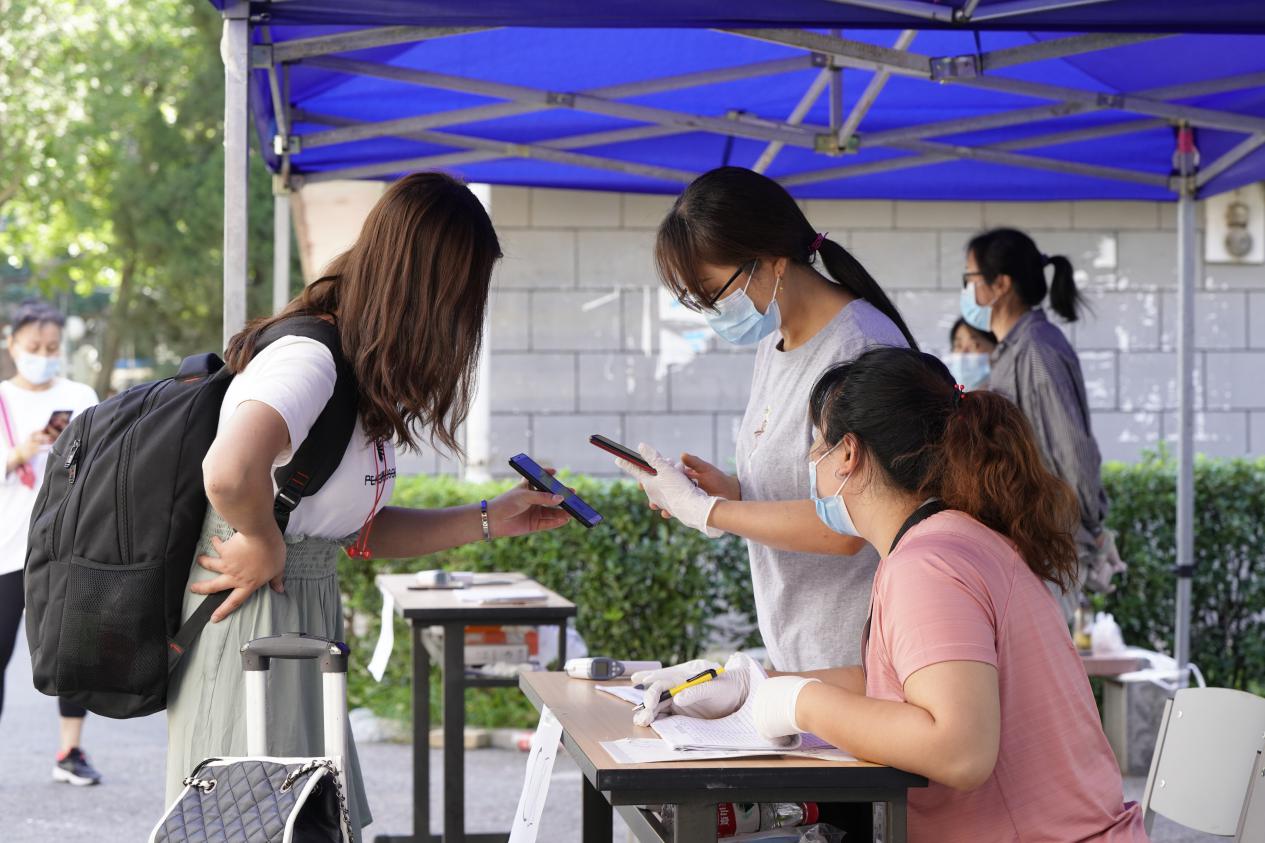 “同学,你好!请出示你的学生证、健康码和核酸检测证明。”在学校南大门、北大门和梆子井学生公寓大门,负责引导学生返校的相关工作人员早早到位,迎接同学们的到来。在工作人员的指引下,同学们依次通过返校报到专用通道,测量体温、身份核验、扫码登记……现场科学规范、井然有序。