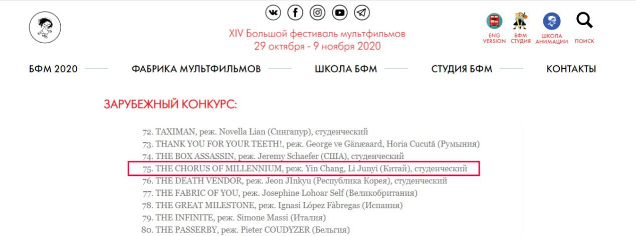 (通讯员 张清越)近日,2020俄罗斯Big Cartoon动画节(The Big Cartoon Festival)官网正式公布入围名单,我校动画与数字艺术学院学生作品《千禧合唱》从来自89个国家和地区的1500余部作品中脱颖而出,入围官方竞赛国际学生作品单元(Official Competition Program –The Foreign Competition of student short animated films),《窝窝》《虫见月》《鲸落入黑夜》《醒梦》与《风筝》则共同入围特别展映单元。