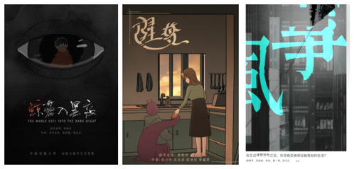 《鲸落入黑夜》是2016级动画专业学生易宝星辰、张珂瑞、张友杰在索晓玲老师指导下完成的联合创作短片。该片以暴雨前夕黄昏,荒野上空突然坠落的巨大鲸鱼为故事伊始,讲述了在寒夜中小男孩与鲸鱼相互取暖的故事,表达了即使双方素不相识,也能在相处中产生真情的温暖主题。《醒梦》是2016级动画专业学生吴冰易、张力丹、骆欣延、黄瀛霄在索晓玲老师指导下完成的联合创作短片,讲述了失去爱人的女主角意外获得小怪物,被小怪物感化并与之萌生出复杂感情的故事。《风筝》是2017级动画专业学生顾峥宇、宗依帆、聂一清、朱岗、刘乃文在索晓玲老师的指导下完成的联合创作短片。以生活在2049年被生活束缚、渴望自由的男主角进入虚拟世界为主线,表达了作者对自由的深度思考。
