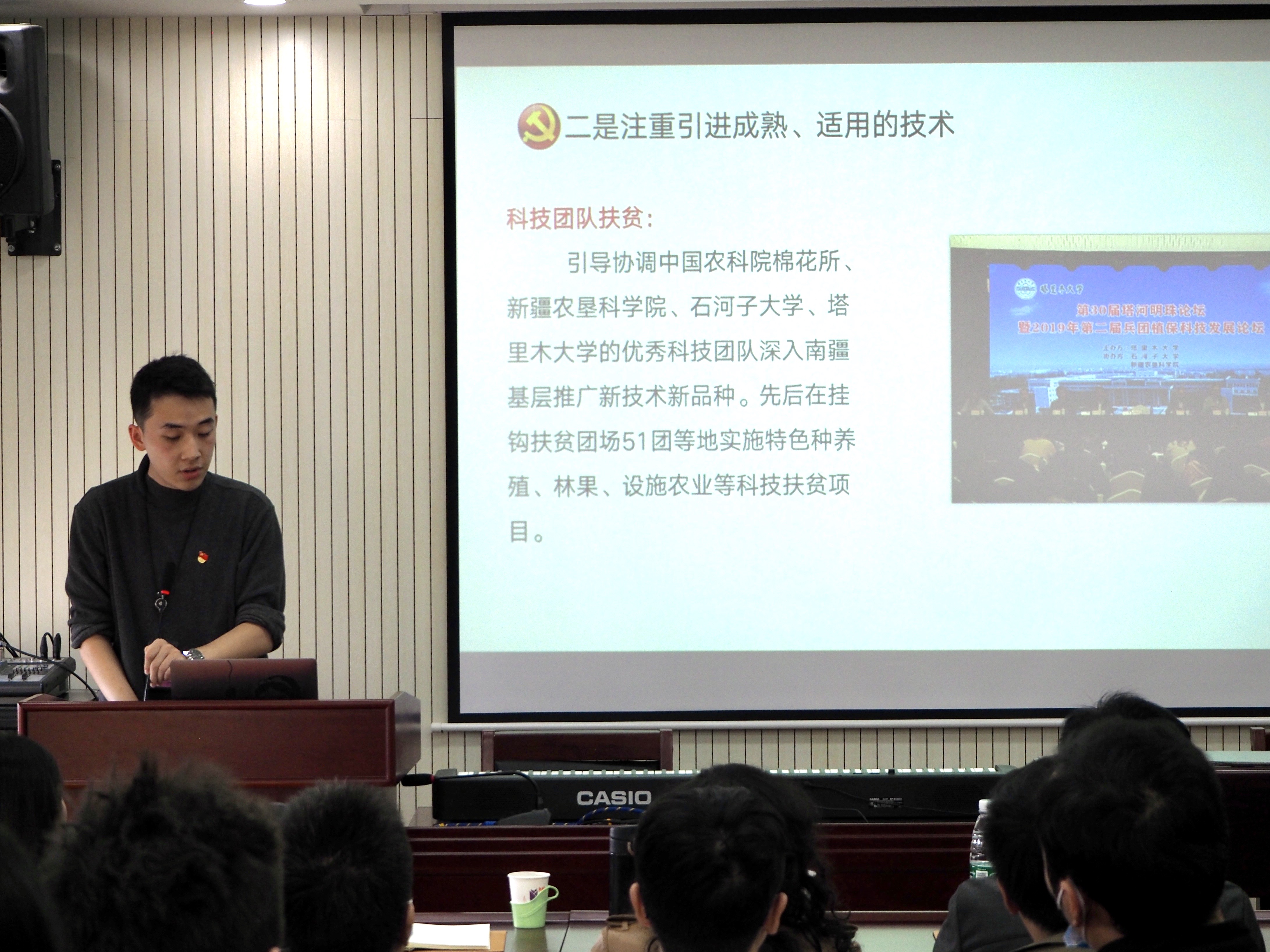 学院教师党员代表游玉栋和研究生党员代表陈莉娜分别作了主题为“科技扶贫——助力边疆群众坐上发展快车”和主题为“扶贫先扶‘智’,扶智先扶‘志’”的支教经历分享。活动现场还开展了“辨一辨”分辨贫困地区特色产品的互动环节,师生党员积极参与,其乐融融。